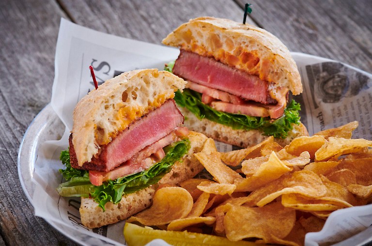 6 oz. Tuna Steak, Blackened and served on a grilled Rosemary Ciabatta Roll with Lettuce, Tomato, and a Roasted Red Pepper Mayo / Prepared Rare | 17