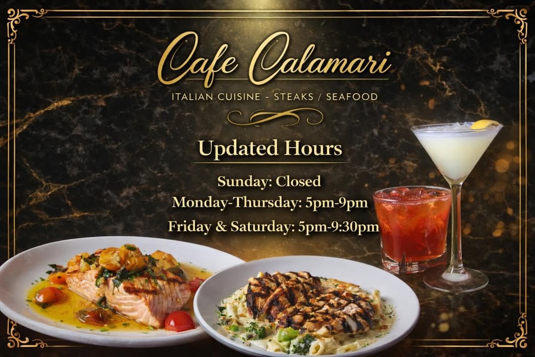 We’re now open every day except Sunday—come dine, sip, and unwind with us at Cafe Calamari 🍷