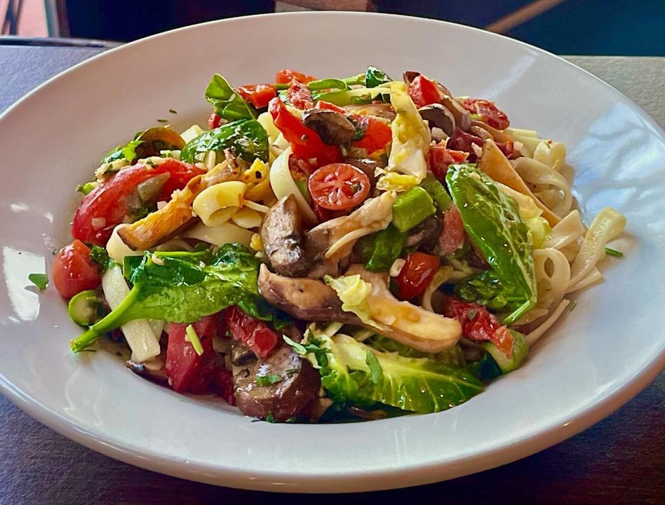 Experience a culinary delight with our Pasta Alesandria, a vibrant medley of fresh, premium ingredients. Savor the rich flavors of Extra Virgin Olive Oil, Spinach, and Wild Mushrooms, perfectly complemented by Roasted Red Peppers and Asparagus. Our dish also features Sun Dried Tomato, Broccoli, Kohlrabi, Carrots, Brussels Sprouts, Kale, and Radicchio, all beautifully tossed with tender Fettuccine.
