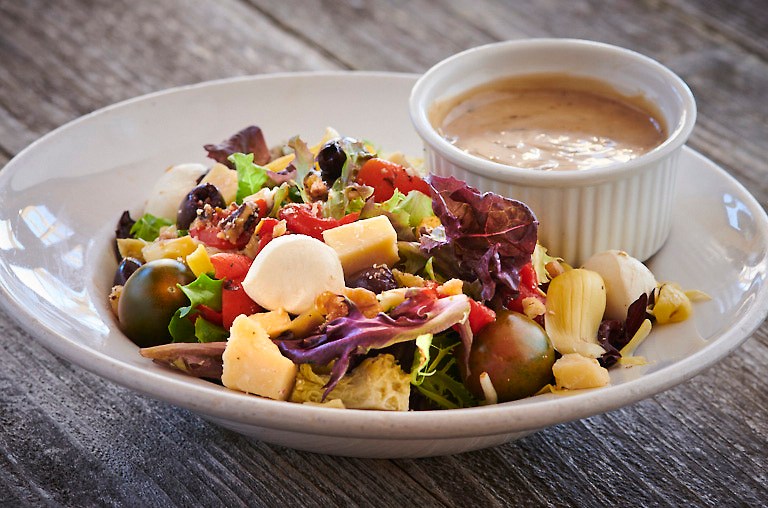 Mesclin Greens tossed with Artichoke Hearts, Roasted Red Peppers, Grape Tomatoes, Olives, Walnuts, Fresh Mozzarella, Fontinella Cheese, and Balsamic vinaigrette and homemade crouton